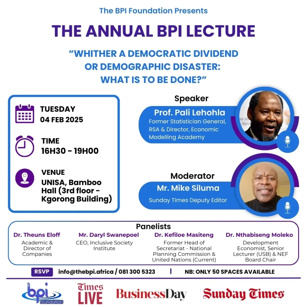 The Annual BPI Lecture at the University of South Africa (UNISA) took place on 05 February 2025 at UNISA’s Pretoria campus. The lecture was titled “Whither a Democratic Dividend or Demographic Disaster: What Is to Be Done?” and featured former Statistician-General, Professor Pali Lehohla, as the main speaker.